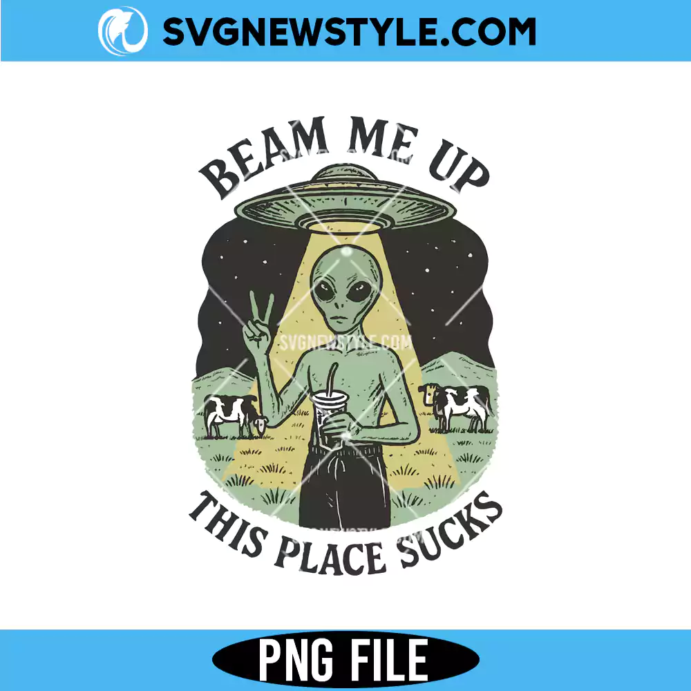 Download Beam Me Up This Place Sucks PNG for Cricut & Silhouette. Funny alien design for shirts, mugs, and crafts.